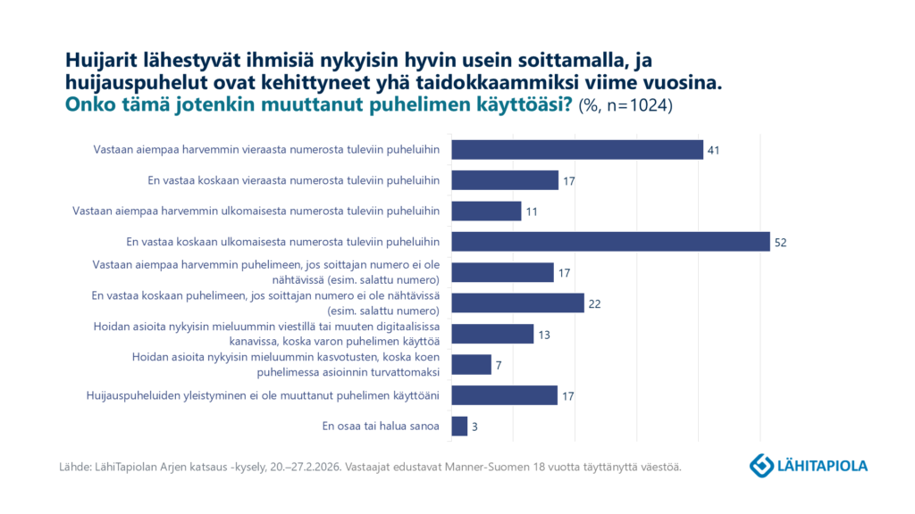 Puhelinhuijarit ovat selvästi aktivoituneet viime kuukausina. LähiTapiolan kyselyn mukaan tietoisuus huijauksista on jo merkittävästi muuttanut suomalaisten puhelimen käyttöä: 40 prosenttia vastaa aiempaa harvemmin vieraisiin numeroihin, ja osa on jopa siirtynyt muihin kanaviin. Tietoturvajohtaja Petteri Ruohomäki: Huijausten riski on hyvä tiedostaa, mutta ei anneta rikollisten estää yhteydenpitoamme.
